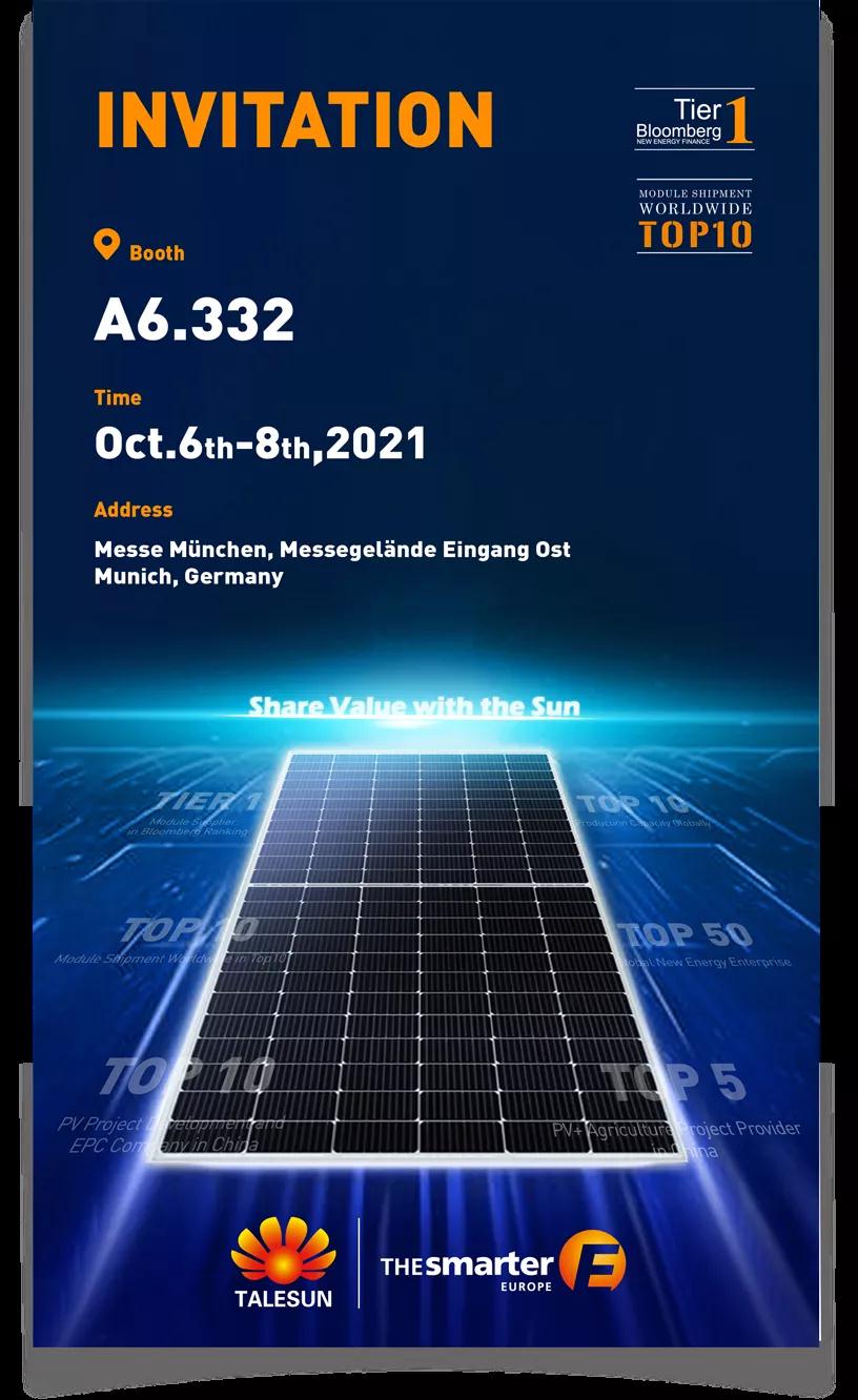 2021年歐洲智慧能源展將于10月6-8日在德國慕尼黑舉行。騰暉光伏將攜系列高效光伏組件亮相歐洲智慧能源展,歡迎蒞臨我們的展臺(tái)A6. 332。